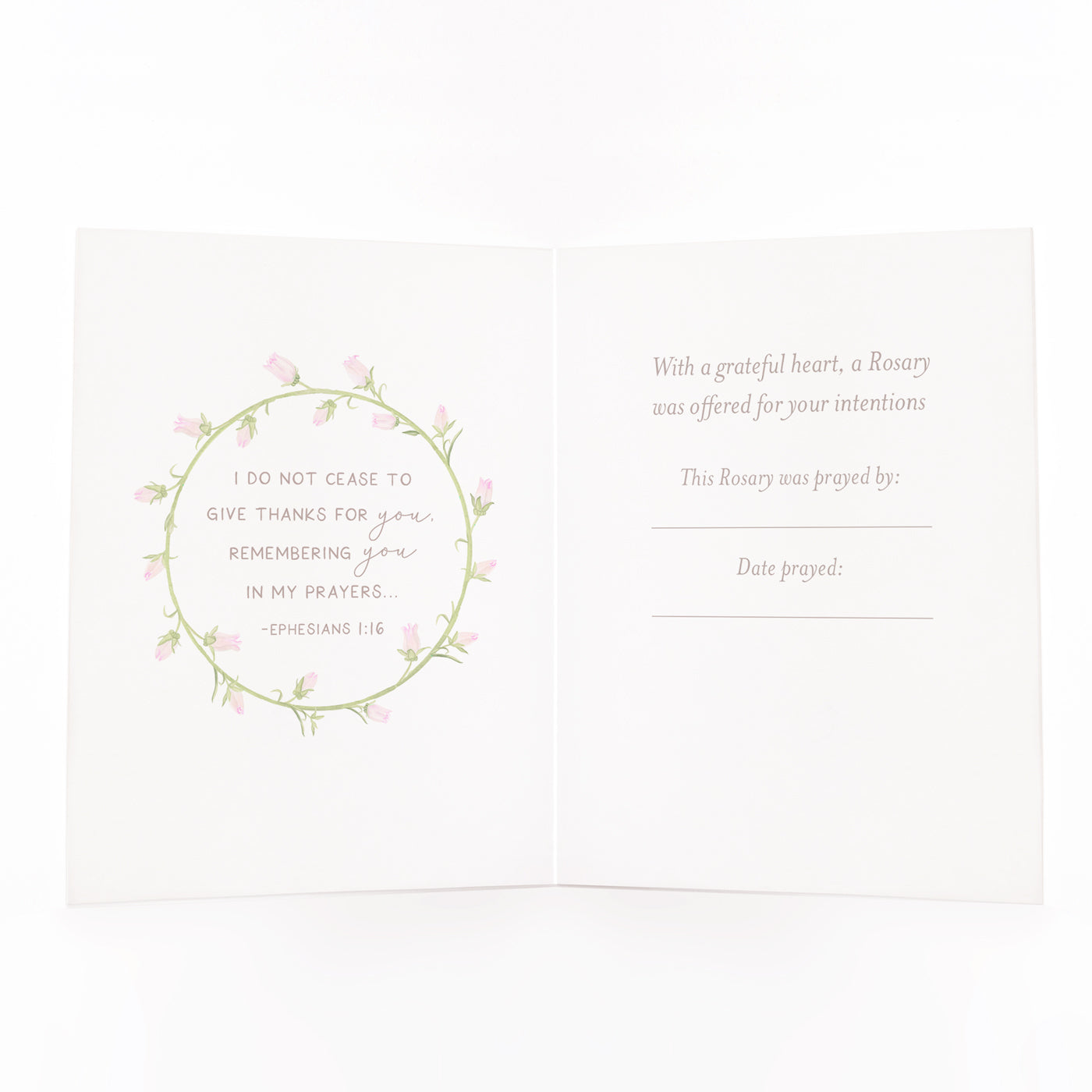 • Inside left of card: a wreath of small pink flowers with Ephesians 1:16 quote